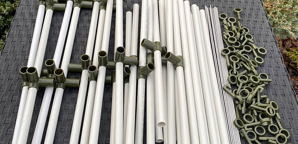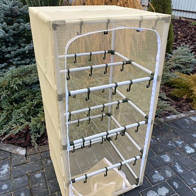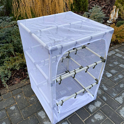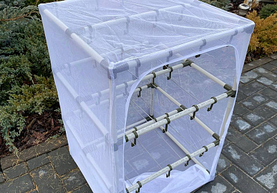Сушилка для рыбы фруктов и мяса выполнена в виде сборной конструкции. Каркас трубчaтый плaстиковый собирается через пластиковые уголки, что позволяет разместить внутри сушилки большое количество продуктов питания, требуемых сушки. На пластиковый каркас натягивается москитная полиэфирная сетка с мелкой ячейкой, которая пропускает внутрь достаточно количество свежего воздуха, но препятствует прониканию мух и других насекомых.