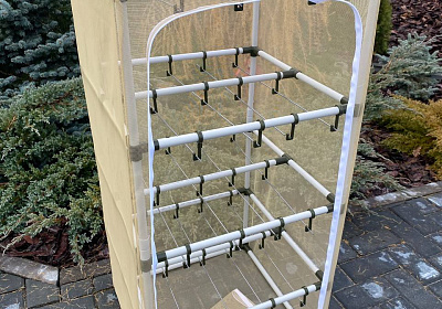 Благодаря тому, что сушилка для рыбы выполнена в виде разборной конструкции, ее можно легко и удобно не только размещать во дворе своего дома или коттеджа, но и перевозить с собой на рыбалку или другой вид отдыха на природе. Попасть внутрь зарытой конструкции сушилки можно с помощью удобной молнии, позволяющей легко подвешивать или снимать продукты с любого яруса. Если сетка загрязнится или будет иметь пятна на поверхности, ее также легко можно снять, выстирать и снова закрепить на каркасе. Сушилка для рыбы подвесная оснащена специальными шпажками, изготовленными из стали, на которые надеваются тушки, а сама шпажка устанавливается на пластиковые крючки, установленные на разном расстоянии друг от друга.